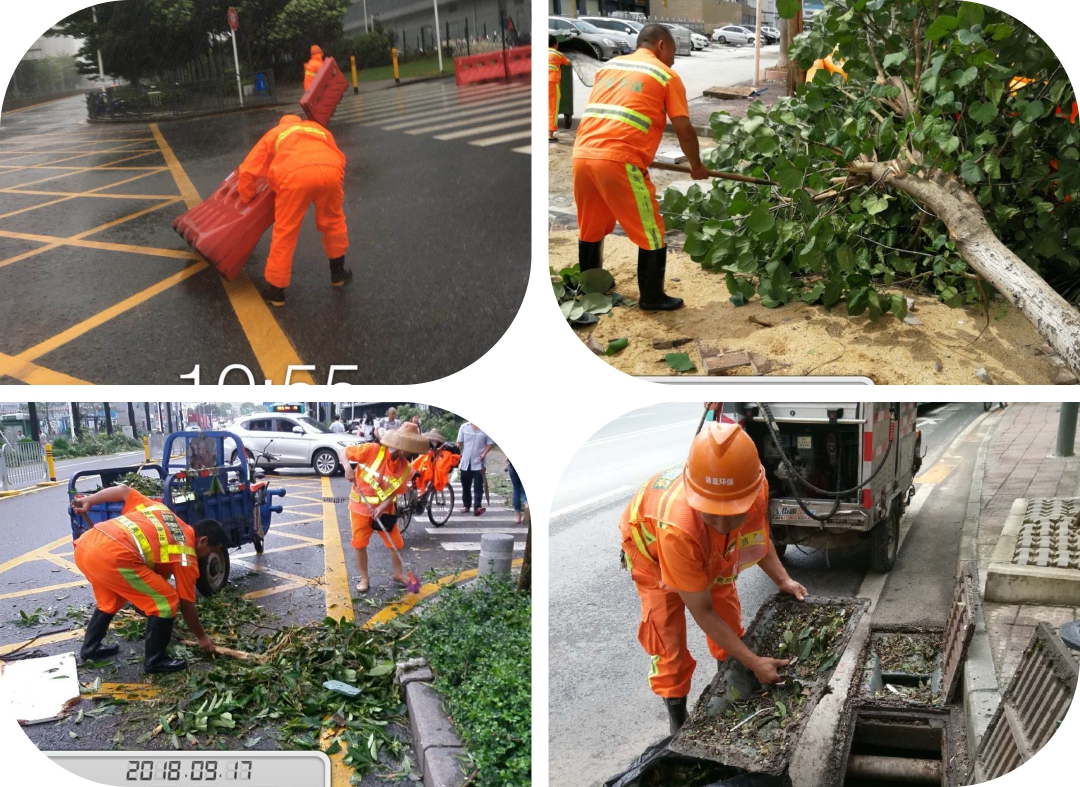 此次特大台风登陆前,太阳集团公司就作好了充分准备,组织快速抢险队伍、应急人员随时待命、各类应急车辆全部进入出发状态。在台风登陆时及时抢险,首先保证安全作业,台风过后,第一时间清理倒下来的大树,保证道路畅通,进行各种应急处置,然后清理树枝树叶及雨水篦子,应急清理路面垃圾,清运也同步进行,快速拉走路面大量树枝及落叶。 |